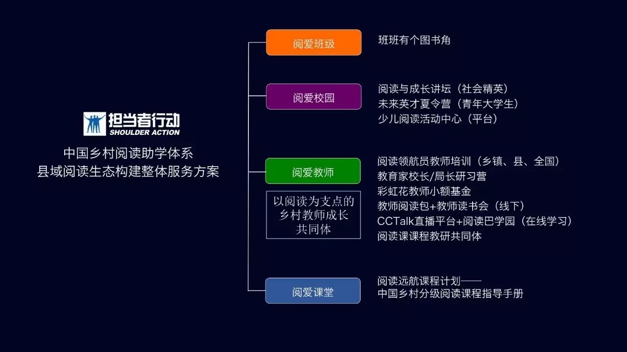担当者行动建立了一个以优质图书为基础,以阅读推广活动和阅读课程为核心的系统化、全方位乡村阅读助学体系,联合当地政府、教育局、校长和老师的力量,为项目服务学校提供高品质儿童分级阅读图书、阅读活动、种子教师职业成长支持、阅读课程等系统服务。