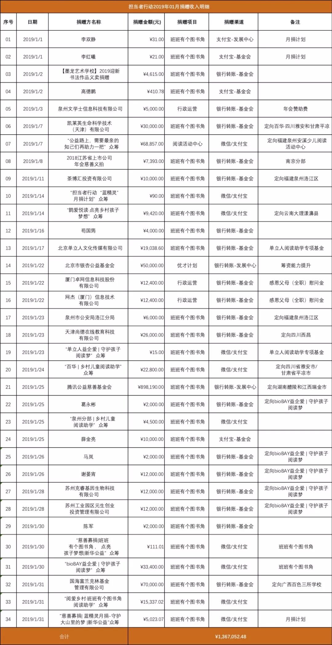 2019年01月,担当者行动共收到社会各界爱心人士和基金会、企业等捐款共34笔,捐款总额为1367052.48元。其中政府捐赠收入6000元,基金会捐赠收入948190元,企业捐赠收入208838.6元,个人捐赠收入32462.78元,众筹捐赠收入171561.1元(其中月捐计划参与人数共计154人)。