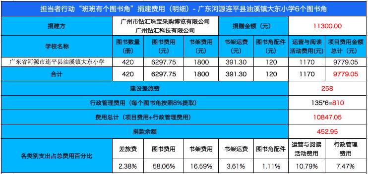 5)捐款余额:将继续用于支持“班班有个图书角”阅读助学项目。
